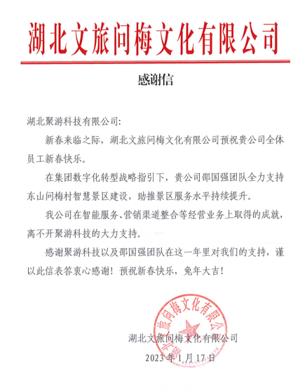 新春到來之際,聚游科技收到來自湖北文旅問梅文化有限公司(黃梅公司)的感謝信。信中寫道:在集團數(shù)字化轉(zhuǎn)型戰(zhàn)略指引下,聚游科技智慧景區(qū)建設(shè)團隊全力支持東山問梅村智慧景區(qū)建設(shè),有力地助推了景區(qū)服務(wù)質(zhì)量提升,助力公司在智能服務(wù)、營銷渠道整合等等經(jīng)營業(yè)務(wù)上取得成就。