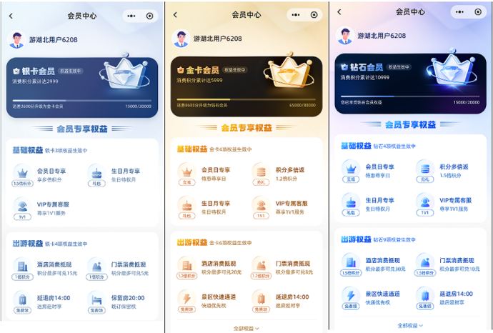 平臺以消費(fèi)、信用和活躍度為核心要素,會員通過消費(fèi)、參與活動、打卡等方式獲取成長值“小旅豆”,完成從銀卡會員升級至金卡會員和鉆石卡會員的成長,享受不同等級的專屬折扣、多倍積分、積分當(dāng)錢花、優(yōu)先預(yù)訂、快速通道、會員日、生日月、跨境禮包、定制服務(wù)等權(quán)益。