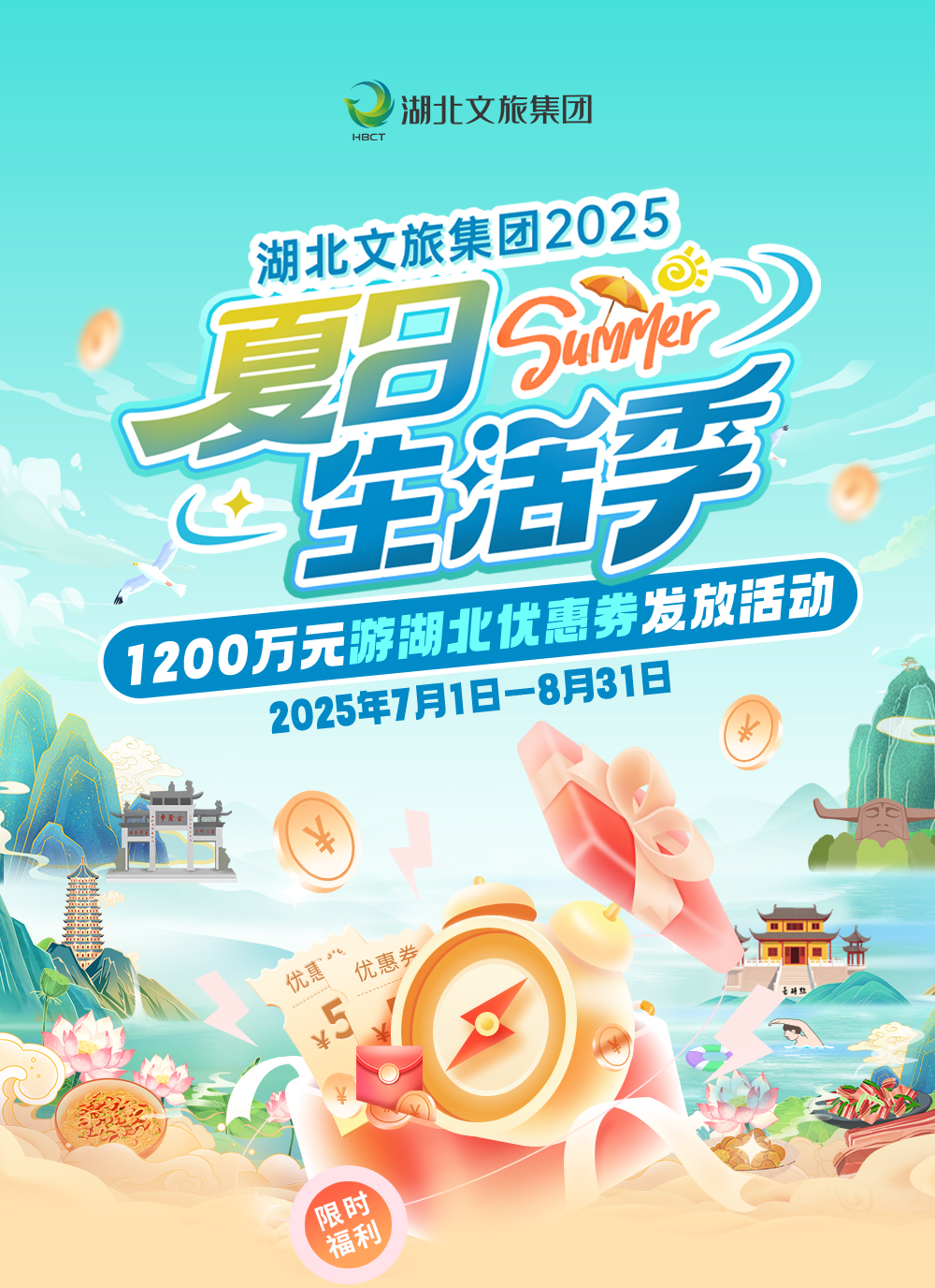 為激活暑期文旅消費市場,數(shù)旅集團在湖北文旅集團“夏日生活季”主題活動框架下,將于7月1日上午10點起通過“游湖北”平臺,面向廣大游客發(fā)放總價值高達1200萬元的“夏日優(yōu)惠券”。本次活動旨在讓游客暢享荊楚大地的夏日魅力,體驗更實惠的湖北之旅。