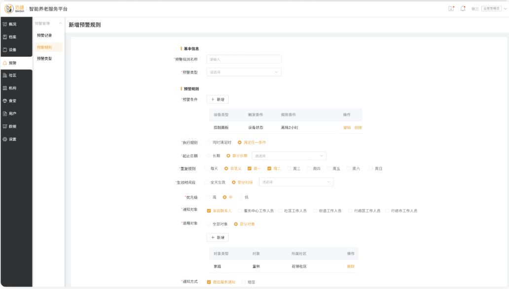 系統(tǒng)會(huì)即刻通過B端管理平臺(tái)、C端移動(dòng)端小程序等多端平臺(tái),向家屬及養(yǎng)老機(jī)構(gòu)工作人員同步發(fā)送警報(bào)信息,確保第一時(shí)間通知到位。以便相關(guān)人員迅速響應(yīng),為老人的安全與健康提供堅(jiān)實(shí)可靠的保障。
