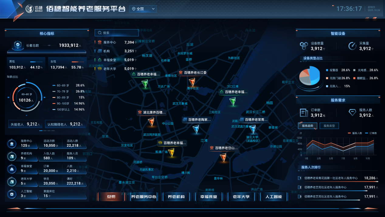全面集成了長者、智能設(shè)備、服務(wù)需求等各類信息,不僅能展示長者總數(shù)、性別年齡分布、失能及認(rèn)知障礙等特殊老人數(shù)量,還涵蓋服務(wù)中心、機(jī)構(gòu)等養(yǎng)老設(shè)施相關(guān)數(shù)據(jù)。通過地圖標(biāo)記、餅圖、折線圖等可視化方式,將復(fù)雜數(shù)據(jù)直觀呈現(xiàn),同時(shí)精準(zhǔn)統(tǒng)計(jì)設(shè)備數(shù)量、采集量、訂單數(shù)等,支持按時(shí)間篩選。