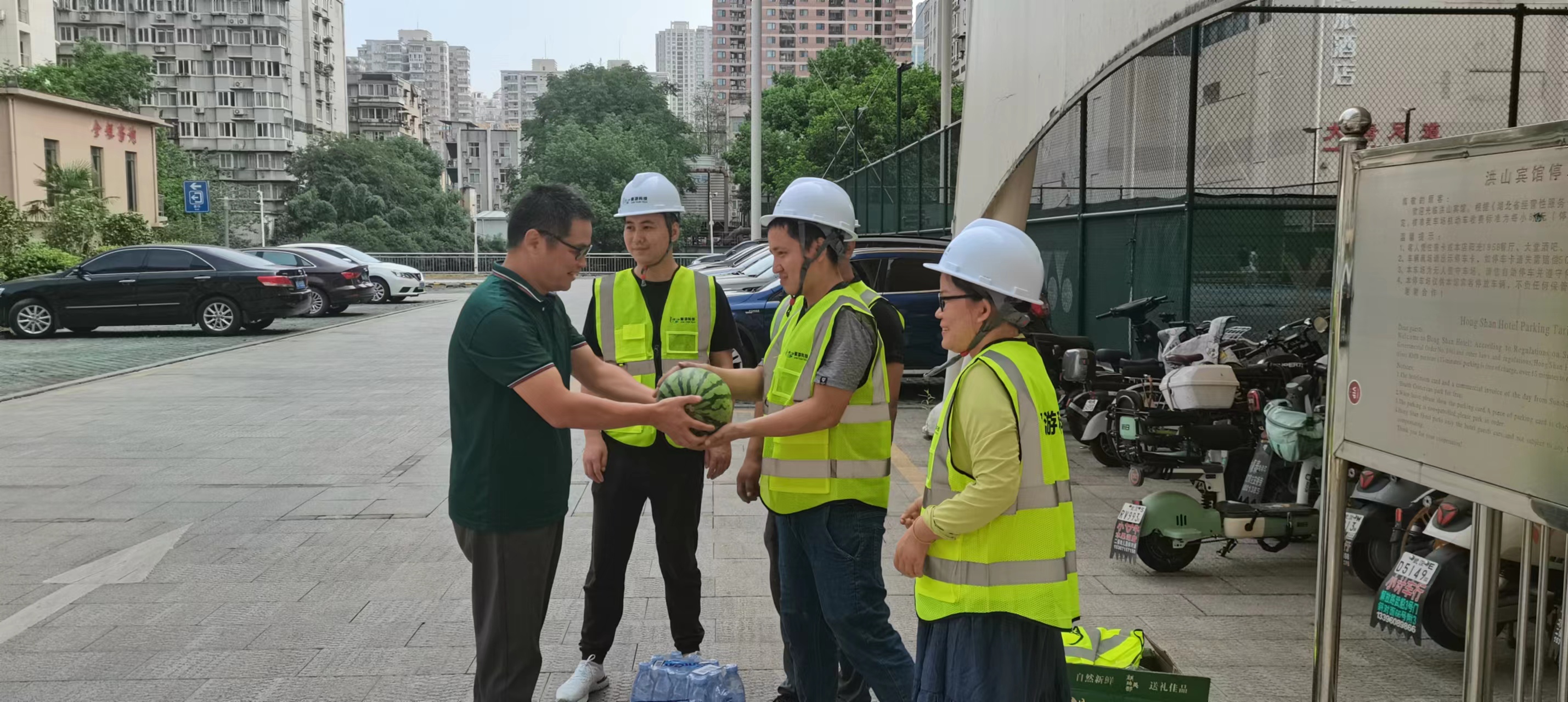8月9日,數(shù)旅集團(tuán)工會(huì)“關(guān)愛(ài)職工 夏送清涼”活動(dòng)走進(jìn)洪山賓館項(xiàng)目施工現(xiàn)場(chǎng),為項(xiàng)目工地一線員工送去工會(huì)的關(guān)懷,現(xiàn)場(chǎng)發(fā)放西瓜、涼茶等防暑降溫物品。慰問(wèn)組肯定全體參建人員不怕吃苦、迎難而上、艱苦奮斗的精神,同時(shí)勉勵(lì)大家要把握良好發(fā)展機(jī)遇,筑牢安全發(fā)展底線,確保項(xiàng)目如期完成。