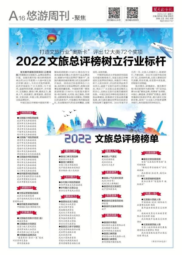 本周熱點(diǎn) 文旅界的“奧斯卡”!古隆中景區(qū)榮獲2022年度中國(guó)文旅總評(píng)榜“最具綜合實(shí)力景區(qū)”等獎(jiǎng)項(xiàng)。2月22日,第十六屆中國(guó)文旅總評(píng)榜正式發(fā)布榜單,古隆中景區(qū)榮獲中國(guó)文旅總評(píng)榜“2022年度最具綜合實(shí)力景區(qū)”、“2022年度文旅營(yíng)銷新銳案例”。中國(guó)文旅總評(píng)榜是在中國(guó)文旅品牌(博鰲)論壇背景下,由中國(guó)城市第一媒體文旅聯(lián)盟(CUMTA)聯(lián)合各方文旅權(quán)威組織精心打造的行業(yè)品牌活動(dòng),被譽(yù)為中國(guó)文旅界的“奧斯卡”獎(jiǎng),是國(guó)內(nèi)最具權(quán)威和影響力的文旅品牌評(píng)價(jià)體系。活動(dòng)自2022年11月啟動(dòng)以來,共收到數(shù)百個(gè)單位和個(gè)人的報(bào)名資料,經(jīng)評(píng)審委員會(huì)專家審定,最終誕生了12大類別、72個(gè)獎(jiǎng)項(xiàng),涵蓋文旅局、景區(qū)、旅游目的地、旅行社、酒店民宿、鄉(xiāng)村振興、演藝夜游、文旅推廣、年度人物等。襄陽古隆中景區(qū)開創(chuàng)了新的文旅融合發(fā)展格局,利用新媒體矩陣,持續(xù)舉辦了多場(chǎng)新媒體活動(dòng),在全國(guó)范圍展示了深厚的三國(guó)文化底蘊(yùn),展示了湖北文旅新形象。 清江畫廊公司榮獲2022年度中國(guó)景區(qū)影響力品牌“年度創(chuàng)新山水型景區(qū)”稱號(hào)。 近日,2022年中國(guó)文旅產(chǎn)業(yè)投資運(yùn)營(yíng)大會(huì)在湖北武漢召開,大會(huì)上公布了2022年度中國(guó)景區(qū)影響力品牌榜單,清江畫廊景區(qū)榮獲“年度創(chuàng)新山水型景區(qū)”稱號(hào)。2022年度中國(guó)景區(qū)影響力品牌排名是通過監(jiān)測(cè)景區(qū)在互聯(lián)網(wǎng)和移動(dòng)互聯(lián)網(wǎng)的搜索、運(yùn)營(yíng)、媒體、點(diǎn)評(píng)指數(shù),綜合分析計(jì)算得出MBI/MCI指數(shù)排名,來反映一段時(shí)間內(nèi)景區(qū)在全國(guó)的品牌影響力,通過海量真實(shí)數(shù)據(jù)制作榜單。清江畫廊景區(qū)的入選,也代表著文旅行業(yè)正在不遺余力的推進(jìn)文化和旅游產(chǎn)業(yè)鏈合作進(jìn)程,推進(jìn)企業(yè)跨越式發(fā)展,努力為市場(chǎng)提交一份滿意的答卷。 海外(中旅)研學(xué)百人團(tuán)首發(fā)啟動(dòng)。以研學(xué)為途徑,博學(xué)而篤志;以自然為媒,躬行求知。2月15日,海外(中旅)集團(tuán)研學(xué)中心帶領(lǐng)330余名學(xué)子們來到了農(nóng)耕年華研學(xué)基地,一場(chǎng)最美的研學(xué)際遇在等待著他們。2023新春首次啟動(dòng)勞動(dòng)教育研學(xué)之旅,共計(jì)330余名小學(xué)學(xué)子們,在海外(中旅)集團(tuán)研學(xué)中心與學(xué)校的共同組織下,將一年級(jí)至六年級(jí)的學(xué)子們劃分為兩個(gè)團(tuán)隊(duì),一至三年級(jí)以國(guó)學(xué)與農(nóng)事為主,將中華國(guó)學(xué)與農(nóng)事生產(chǎn)文化代代相傳,既豐富了勞動(dòng)體驗(yàn),又積累了國(guó)學(xué)底蘊(yùn)。四至六年級(jí)以手工與農(nóng)耕為主,從小養(yǎng)成熱愛勞動(dòng),勤于實(shí)踐,珍惜糧食,懂得感恩的優(yōu)秀品德并受益終生。 最新資訊 ● 甘肅寧夏攜手打造“大西北”文旅IP。寧夏回族自治區(qū)文化和旅游廳與甘肅省文化和旅游廳在甘肅蘭州進(jìn)行座談交流,共商大西北文旅抱團(tuán)發(fā)展、做大做強(qiáng)大西北文旅品牌,合力促進(jìn)文旅消費(fèi)復(fù)蘇等事宜。根據(jù)會(huì)議消息,甘肅省文旅廳將全力支持寧夏文旅廳提出的關(guān)于“共商籌備第二屆大西北文旅高峰會(huì)、市場(chǎng)化發(fā)行西北旅游一卡通、成立西北生態(tài)康養(yǎng)旅游聯(lián)盟、做大做強(qiáng)大西北文旅品牌”等合作事宜和相關(guān)業(yè)務(wù)工作;寧夏文旅系統(tǒng)將著力加強(qiáng)戰(zhàn)略協(xié)作,精誠(chéng)推進(jìn)全面融合,共同打造好“大西北”這個(gè)獨(dú)特而共有的超級(jí)文旅大IP,深度推進(jìn)與兄弟省區(qū)的合作,共同提振旅游經(jīng)濟(jì),大力促進(jìn)文旅復(fù)蘇發(fā)展,合力推動(dòng)雙方文旅系統(tǒng)在更大范圍、更寬領(lǐng)域、更深層次開創(chuàng)務(wù)實(shí)合作新局面。 ● 成都高質(zhì)量打造文旅經(jīng)濟(jì)發(fā)展核心區(qū)推動(dòng)世界文化名城建設(shè)。2月22日,成都市文化廣電旅游局發(fā)布《高質(zhì)量打造全省文旅經(jīng)濟(jì)發(fā)展核心區(qū)推動(dòng)世界文化名城建設(shè)行動(dòng)方案》。到2025年,力爭(zhēng)實(shí)現(xiàn)成都市文創(chuàng)產(chǎn)業(yè)增加值3100億—3400億元,占GDP比重達(dá)到12%以上,旅游接待游客達(dá)到3.5億人次,總收入達(dá)到6300億元,文化產(chǎn)業(yè)增加值占全省比重達(dá)到53%,旅游總收入占全省比重增長(zhǎng)到39%。實(shí)施文創(chuàng)、旅游企業(yè)梯度培育計(jì)劃,支持本土龍頭企業(yè)上市及沖刺全國(guó)文化企業(yè)30強(qiáng)、中國(guó)旅游集團(tuán)20強(qiáng),實(shí)現(xiàn)省級(jí)文化和旅游產(chǎn)業(yè)優(yōu)秀龍頭企業(yè)達(dá)到15家以上。 ● 長(zhǎng)沙打造文旅業(yè)“復(fù)原力” 發(fā)放400萬元消費(fèi)券。長(zhǎng)沙市文化旅游廣電局制定出臺(tái)了《關(guān)于促進(jìn)文旅產(chǎn)業(yè)穩(wěn)定發(fā)展的若干措施