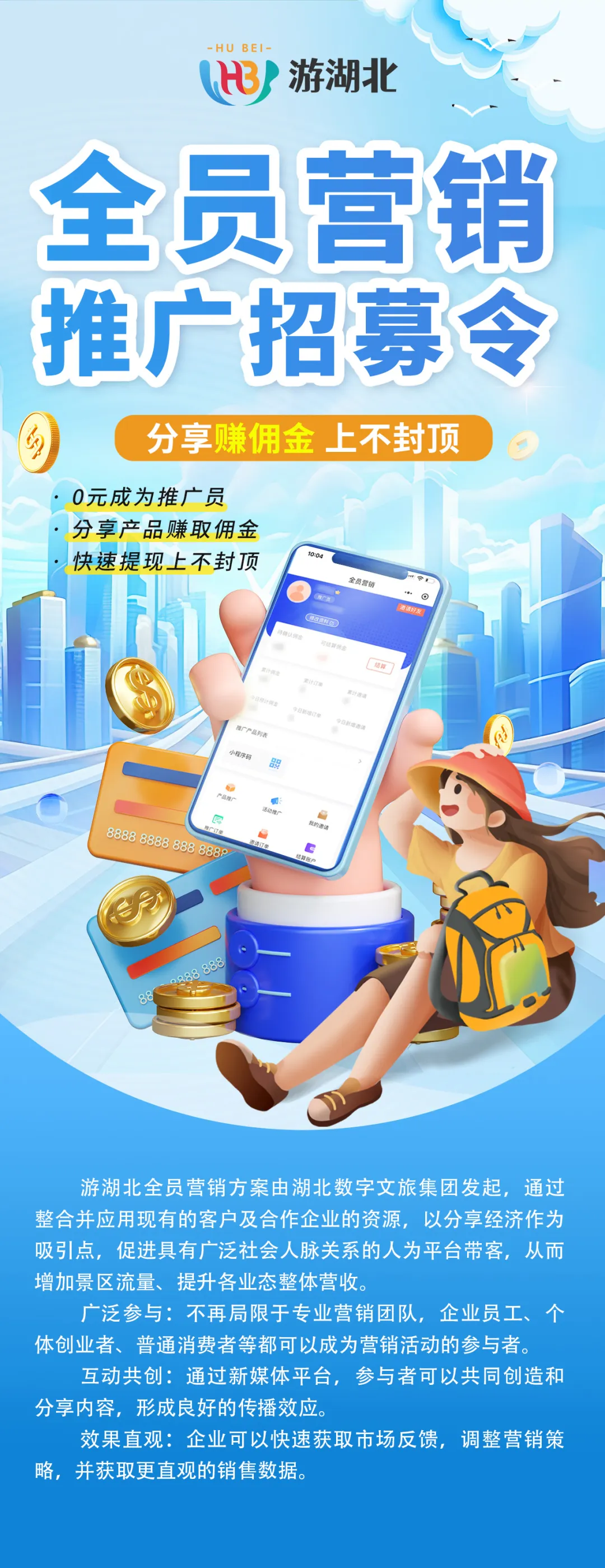 “游湖北”推出全員營(yíng)銷推廣招募令。游湖北全員營(yíng)銷計(jì)劃由湖北數(shù)字文旅集團(tuán)發(fā)起,邀請(qǐng)公眾參與旅游產(chǎn)品推廣。參與者只需通過“游湖北”小程序注冊(cè)成為推廣員,選擇產(chǎn)品并分享生成的海報(bào)給潛在游客,即可在游客下單核銷后獲得傭金。這一模式利用新媒體平臺(tái)實(shí)現(xiàn)內(nèi)容共創(chuàng)與互動(dòng),幫助企業(yè)迅速響應(yīng)市場(chǎng)變化,優(yōu)化營(yíng)銷策略。