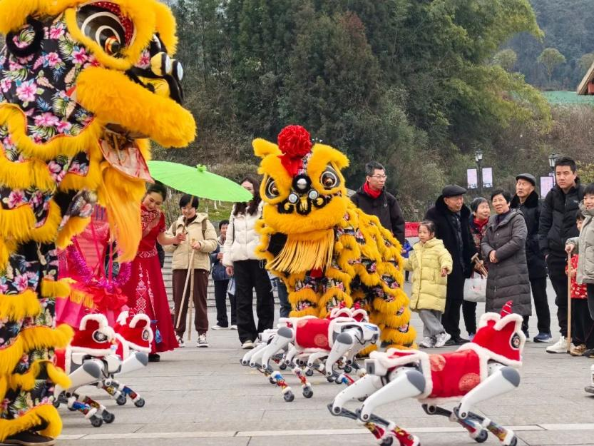 科技過年,機(jī)器狗成新春“網(wǎng)紅”。正月初一至元宵節(jié),數(shù)旅集團(tuán)聯(lián)合恩施大峽谷推出的“機(jī)器狗”春節(jié)舞蹈隊(duì)將在景區(qū)開展迎賓、舞蹈一條龍服務(wù)。機(jī)器狗舞蹈隊(duì)展示迎賓舞蹈、參與舞獅互動(dòng)、太空步融合土家擺手舞,科技感和民俗范在峽谷山水間擦出火花。為游客帶來全新的游覽體驗(yàn),增添節(jié)日樂趣,提升景區(qū)的服務(wù)質(zhì)量和吸引力。
