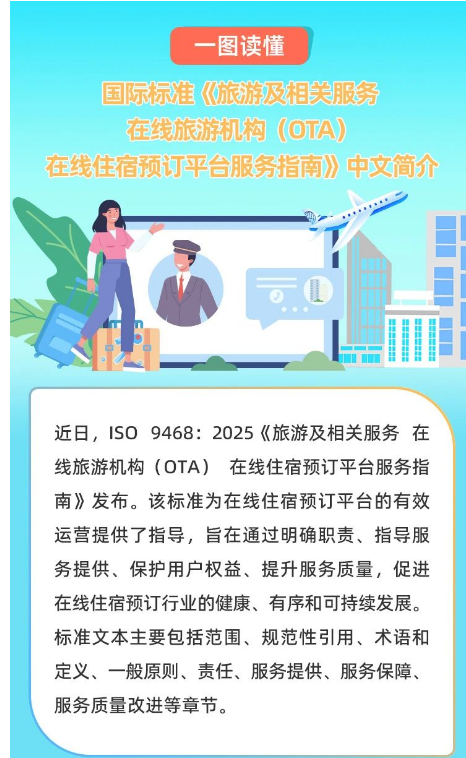我國(guó)牽頭制定全球首個(gè)在線旅游機(jī)構(gòu)相關(guān)國(guó)際標(biāo)準(zhǔn),以“中國(guó)方案”推動(dòng)全球旅游服務(wù)標(biāo)準(zhǔn)化進(jìn)程。近日,我國(guó)牽頭制定的《旅游及相關(guān)服務(wù)在線旅游機(jī)構(gòu)(OTA)在線住宿預(yù)訂平臺(tái)服務(wù)指南》(ISO9468:2025)國(guó)際標(biāo)準(zhǔn)正式發(fā)布。這是全球首個(gè)在線旅游機(jī)構(gòu)相關(guān)國(guó)際標(biāo)準(zhǔn),旨在規(guī)范全球在線住宿預(yù)訂平臺(tái)及其服務(wù),破解“大數(shù)據(jù)殺熟”“捆綁消費(fèi)”“退改難”等痛點(diǎn),構(gòu)建公平透明的消費(fèi)生態(tài)?!吨改稀访鞔_了平臺(tái)方和住宿服務(wù)提供商的責(zé)任,規(guī)范了訂購(gòu)、支付、退改、評(píng)價(jià)等環(huán)節(jié)的服務(wù)條款,提出了信息安全、財(cái)務(wù)安全和隱私保護(hù)等方面的服務(wù)保障要求。其發(fā)布是中國(guó)參與全球標(biāo)準(zhǔn)化工作的生動(dòng)實(shí)踐,將推動(dòng)全球旅游服務(wù)在標(biāo)準(zhǔn)化軌道上實(shí)現(xiàn)高質(zhì)量發(fā)展。